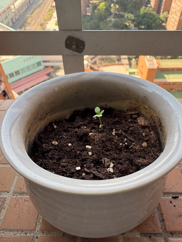 賽馬會對幼兒教育不遺餘力,每年派了一盒玩具予他們。今年竟然派發種植套裝,可以種薄荷、小雛菊和蕃茄。想起以前小時候阿妹靠這類套裝,成功種出蕃茄,我不禁蠢蠢欲動,拿幾個盆播種。兩星期後只有小雛菊成功發芽。