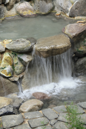 園內的淙淙小溪其實是溫泉水,起初想脫去鞋子泡腳,可是經過這間公共露天溫泉區的時候,就算背著那麼多東西,我也要浸一浸,因為太熱了。這間露天溫泉池是穿泳池入浴的,先用淡水沖洗身體便開始泡湯了。先由腳部進池,待身體適應溫度才慢慢泡至肩膊附近。由於溫泉水比較熱,不宜浸頭部。起初皮膚有點刺痛,一會兒全身很舒服,先前酸軟的雙腳回復狀態,那時我感到心跳加速,未過三分鐘後便要上水休息,以免身體不勝負荷。那裡有四種溫度的池,由冰涼到甚熱,我不敢挑戰溫度最高的池。這是我才想起自己沒帶浴巾,怎麼辦呢?惟有用手帕胡亂抹過便匆匆回酒店更衣了。