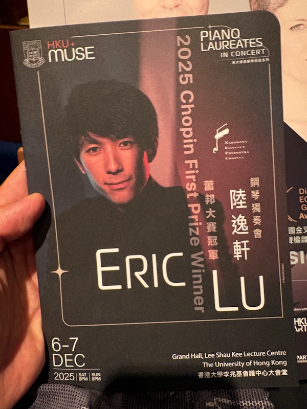 知道佢攞冠軍,HKU 今日場蕭邦冠軍concert 肯定係佢彈,即刻買埋剩低嗰一張平價飛。大家放心,個hall絕對係正嘢嚟,我今日坐喺樓上聽歌,完全接收晒Eric Lu嘅詮釋。以為個場在山頭好遠,其實搭地鐵落車之後搭兩次𨋢即達,唔駛日曬雨淋,缺點係完場後附近無嘢食啫。